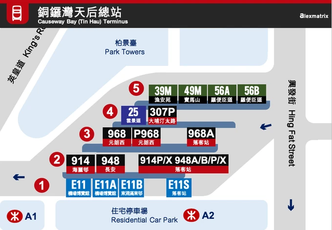 | 九巴、城巴 | 914 | 天后站 | 海麗邨 | 每天服務● |