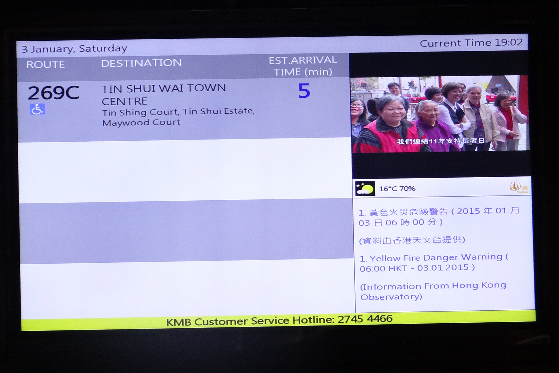 與九巴網站不同,班次顯示屏提供的預計到站時間,是當前時間與下一班巴士預計到站時間之間尚餘多少分鐘的倒數形式顯示,模式與港鐵乘客資訊顯示屏相同。