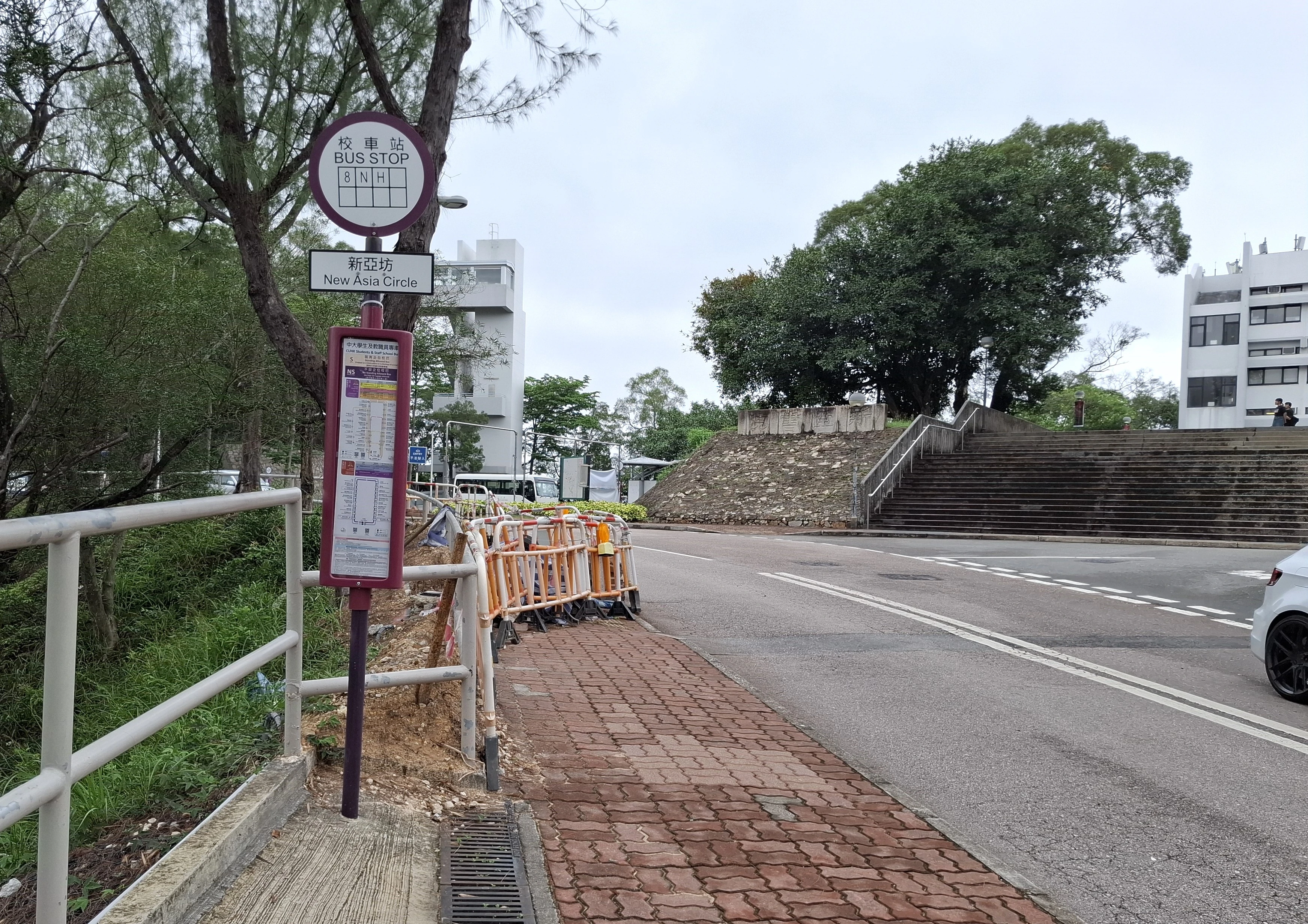 此站早年一直沒有豎立站牌,僅在路邊欄杆掛上貼有路線編號的木板告示權充,直至2017年10月校方才在該處豎立正式站牌。