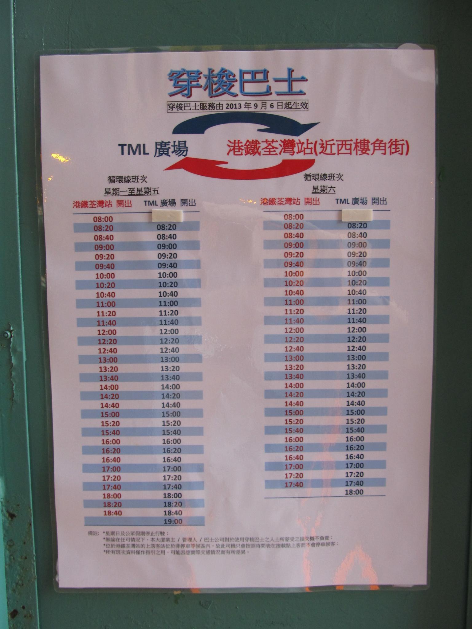 | 陽光巴士 | TML廣場穿梭巴士 | TML廣場 | 荃灣站 | 星期一至六服務 |
