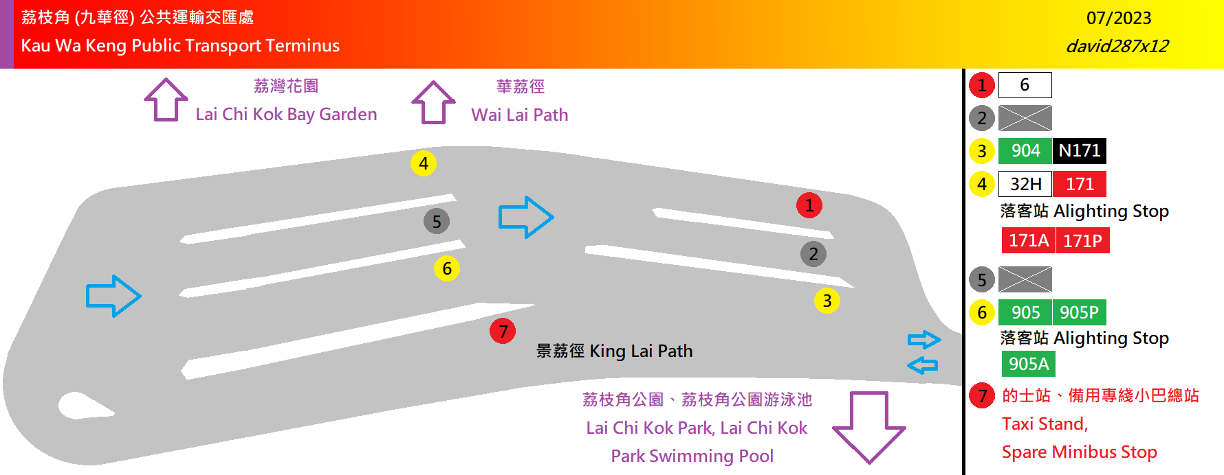 - ↑ 第7916號公告:〈道路交通 (交通管制) 規例 (第374章)--九華徑公共交通總站》,香港特別行政區政府憲報第04卷第48期,2000年12月1日。