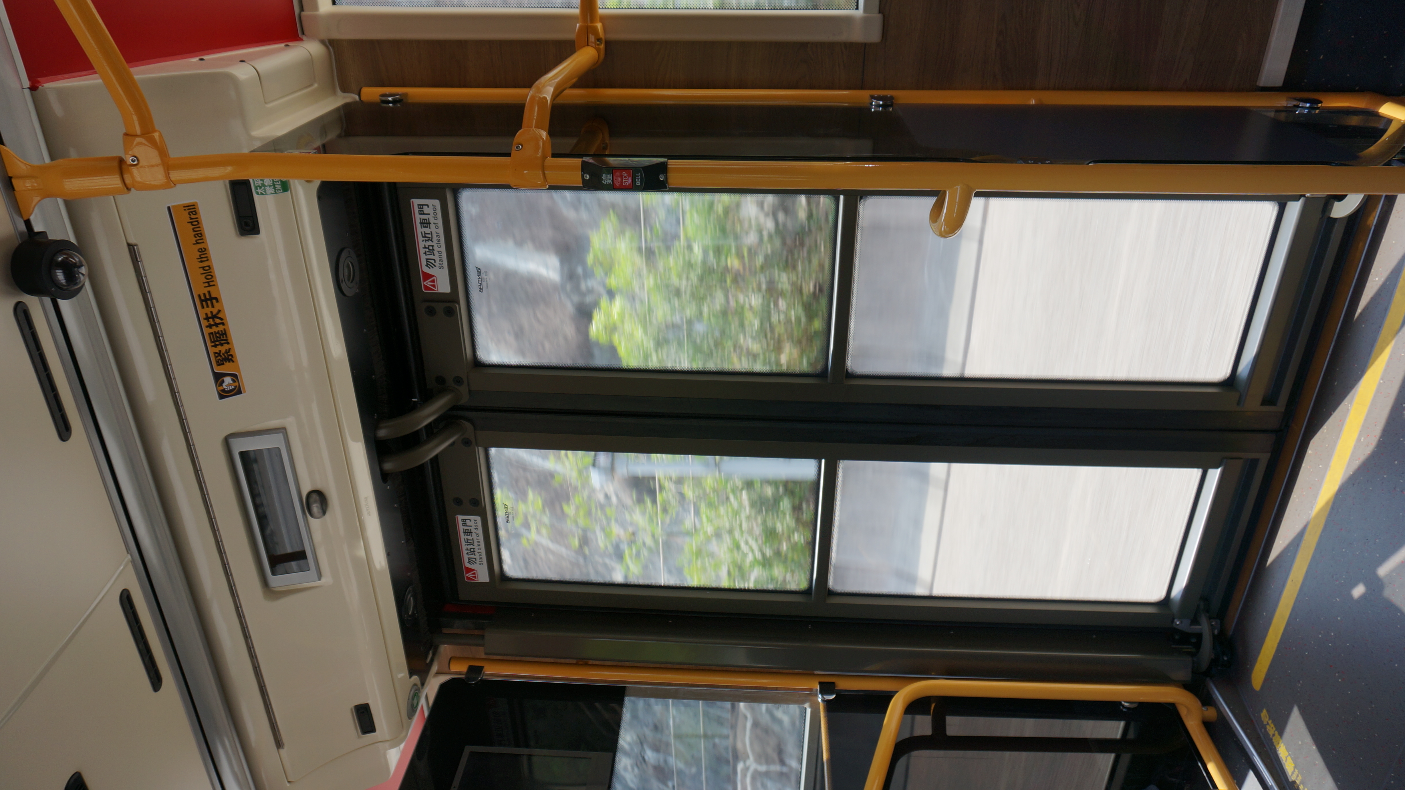 九巴Enviro500 MMC(ATENU)落車門地面劃有黃線,並於附近貼有「勿站越黃線」及「勿站近車門」警告標語